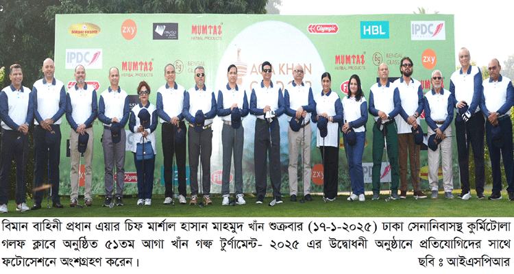 Staff Reporter, Dhaka : 51 st Aga Khan Gold Cup Golf Tournament has started at Kurmitola Golf Course from 16-18 January 2025. Chief of Air Staff of Bangladesh Air Force Air Chief Marshal Hasan Mahmood Khan, BBP, OSP, GUP, nswc, psc inaugurated the 3 day long tournament as the chief guest on 17 January 2025, Friday. 500 golfers are participating in this tournament from all clubs of the country including representatives of the diplomatic community in Bangladesh.